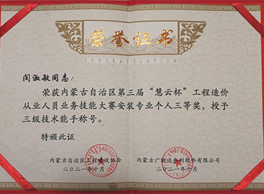 我司閆淑敏獲得《內(nèi)蒙古自治區(qū)第三屆“慧云杯”工程造價(jià)從業(yè)人員業(yè)務(wù)技能大賽》個…
