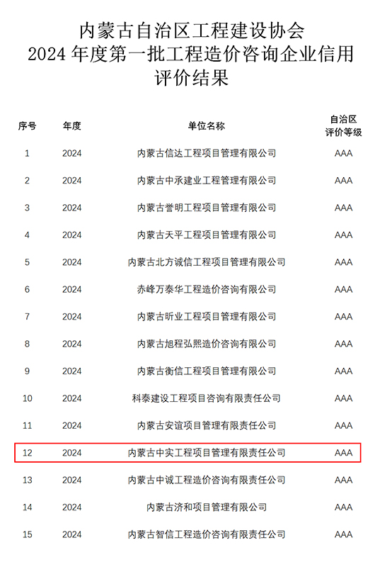 2024-07-3014850 次近期,我公司參加內(nèi)蒙古自治區(qū)工程建設(shè)協(xié)會組織的“2024年度第一批工程造價(jià)咨詢企業(yè)信用”申報(bào),獲得“信用AAA級證書”。我公司成立多年以來,遵循中國工程造價(jià)管理協(xié)會對造價(jià)咨詢企…